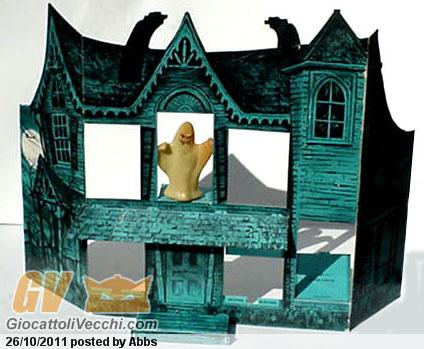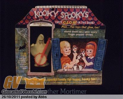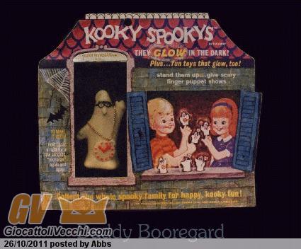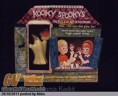 ciao bat!!! !!! ! grazie!!! personalmente non avevo mai partecipato ad un forum ed ho iniziato a scrivere in questo circa un mese fa, quindi non conosco praticamente nessuno, ma con tutti quelli che ho avuto il piacere di conoscere, mi sono trovato veramente stra benissimo. tutte persone cordiali, che hanno voglia di divertirsi e scherzare. credo che questo accada perchè siamo tutti legati dalla stessa passione che per me, per esempio, rappresenta un hobby rilassante che mi da un pò di respiro dalla vita caotica di tutti i giorni, e mi piace quindi discutere con tutti di oggetti e cose che ci piacciono e rappresentano dei ricordi indelebili. spero di conoscere sempre più persone con la mia stessa passione, oggi ho conosciuto te e led1979 e mi ha fatto tanto piacere!!! e spero sempre di intraprendere chiaccherate divertenti con tutti. a me piace molto l`aspetto artistico del giocattolo e tutto l`iter di creazione che ci sta dietro, come i disegni, i progetti, le idee e soprattutto le fonti di ispirazione degli ideatori, cosa che nei masters, per esempio, è molto bella da analizzare. hanno un background molto ricco di fonti. devo dire che mi sono trovato molto, molto, molto, molto bene in questo forum, veramente pieno di persone appassionate ed iper preparate!! c`è tanto da imparere, e la materia è una delle poche che mi piace : ) ho trovato veramente tante persone gentili con cui mi sento in sontonia ed appassionate quanto e più di me. grazie ancora bat!!! !!!! e visto che parliamo di passioni ecco un altro gioco glow direttamente dalla mia mente malata con il cervello in putrefazione e pieno di vermi!!! anno 1968, marca HASBRO. nome KOOKY SPOOKYS. genere...beh, che dire, il prodotto è molto semplice: una famiglia di fantasmini venduti separatamente ed ognuno dentro una casetta, che si potevano utilizzare come " marionette ditali " licenza poetica, cioè invece di usare tutta la mano, visto che erano piccolissimi, bastavano le dita. tutto qui. i fantasmini ovviamente erano fosforescenti. a me sono simpatici perchè mi ricordano un pò la famiglia dei fantasmini di Lavasbianca è fantasmaticò! direi che non c`è altro da aggiungere tecnicamente riguardo a questi giochi, a parte il fatto che erano anche dotati di un playset veramente bellissimo per l`epoca e con un`anima veramente fantasmagorica e decrepita, dovuta al suo materiale incosistente: il cartone. a me piacerebbe averli in collezione. bello il playset come soprammobile, magari vicino ad audiovisvi horror. veramente di gusto horror old style!! cordiali saluti e w i fagioli.