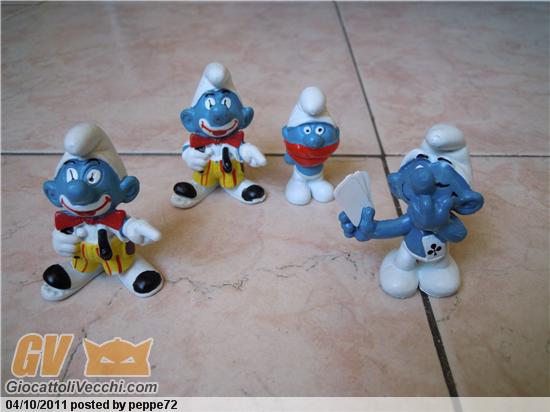 Puffo Baro con carte da gioco : 5 euro Puffo Re : 4 euro puffo sonnamblo : 12 euro puffo con flauto : 5 euro puffo dottore : 5 euro puffo meccanico : 5 euro puffo con mandolino : 6 euro puffo che ride : 5 euro puffetta : 5 euro puffo con tromba : 6 euro puffo pittore : 6 euro Puffo montanaro : 5 euro