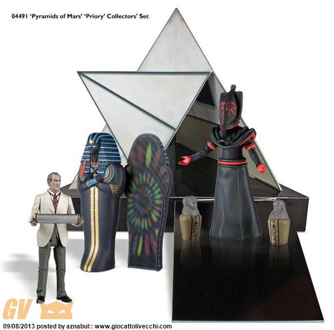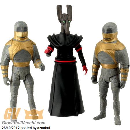 Con me caschi alla grande io sono un fanatico di quelle poche puntate trasmesse dalla RAI all`ora, mi hanno rapito e non mi hanno mai più lasciato, aggiungo alla tua descrizione che lo sciacallo è il malvagio Sutek con faccia da sciacallo ma forse anche di Anubis che visto era una puntata ispirata a piramidi lo si poteva anche accostare appunto la culto egizio, le due mummie sono i guardiani dell`indovinello su marte quando Sara resta prigioniera del cilindro e uno menitva smepre e l`altro diceva sempre la verità, perchè a differenza poi ci sono le mummie senza bordatura dorata che sono sulla terra e che devono costruire il necessario per liberare Sutek su marte dalla sua prigionia millenaria...che puntata strepitosa di tanto in tanto la riguardo. Tornando ai personaggi li si possono reperire anche dal più noto sito di acquisit on line ma i prezzi sono vergognosi, mi sono informato e il prezzo al pubblico a Londra è di 19, 00 POUND e non 40 + spedizione come i veri sciacalli chiedono, spero che vi possa essere d`aiuto il poco che ho detto sull`articolo, l`altro non ne ho visionato alcuno al momento.