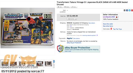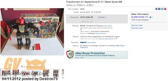 Asta del 4 Novembre 2012 Sito: Ebay.com Item: Takara - Transformers Masterforce D-311 Black Zarak MIB Link Asta www.ebay.com/itm/Transformers-G1-Masterforce-D-311-Black-Zarak-MIB-/140876065451?_trksid=p2047675.l2557&ssPageName=STRK:MEWAX:IT&nma=true&si=Mo5JOvSzyxsEmCbu6kzYgDtuac8%3D&orig_cvip=true&rt=nc Prezzo: USD 1.026 = EUR 798, 75