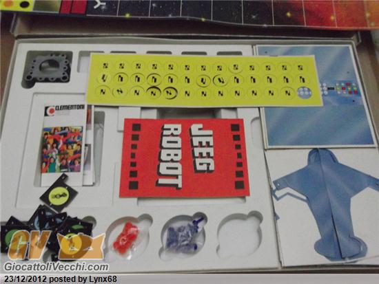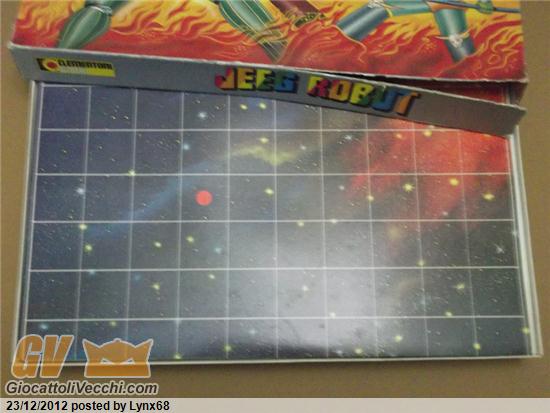 JEEG ROBOT Clementoni Scatola discreta coperchio con 3 spigoli aperti, contenuto scatola Tabellone buono/ottimo, 4 basi cartonate e 4 astronavi di cartone ancora da assemblare buone, Cartonicino con dischetti gialli Manca 1 discetto buono, i cartonicini neri con i numeri sono 15 buoni e due sacchettini di bottoncini rossi e blu, istruzioni e catalogo pubblicitario clementoni + torrettina in plastica grigia.