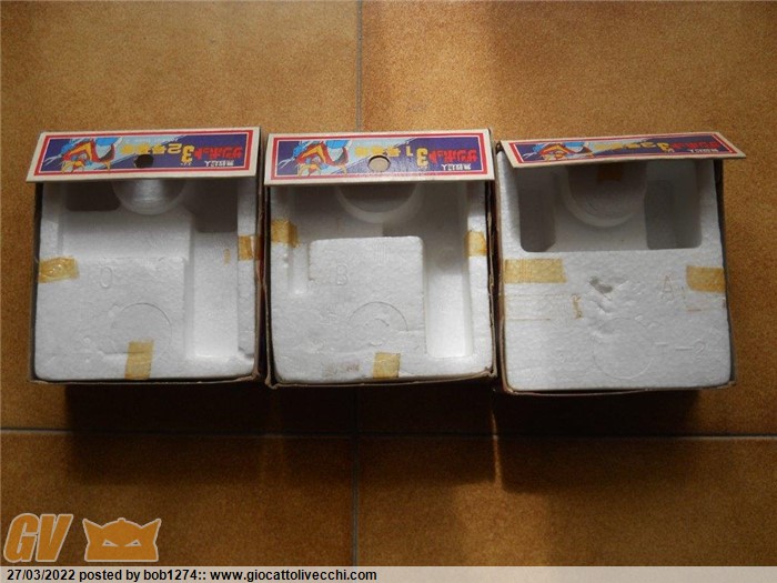 Ps , se bisogna essere proprio pignolissimi , anche se mai giocate, le uniche pecche che ho trovato durante i controlli dopo l’apertura sono : mal cromatura delle ali posteriori della base n.2 gialla , non sembrano affatto delle scromature ( vedere foto effettuate ) , scatole da considerarsi in buone condizioni nonostante l’enorme tempo passato , vedere le foto effettuate ( per i box / scatole n.1 e n.2 si nota che sono state tolte molto probabilmente le vecchie etichette prezzi e quindi si sono distaccate le parti colorate sottostante del box , per il box n.3 invece ritrovato sotto una scatola più pesante e si nota una pressione data dal peso sopra avuto nel tempo ).