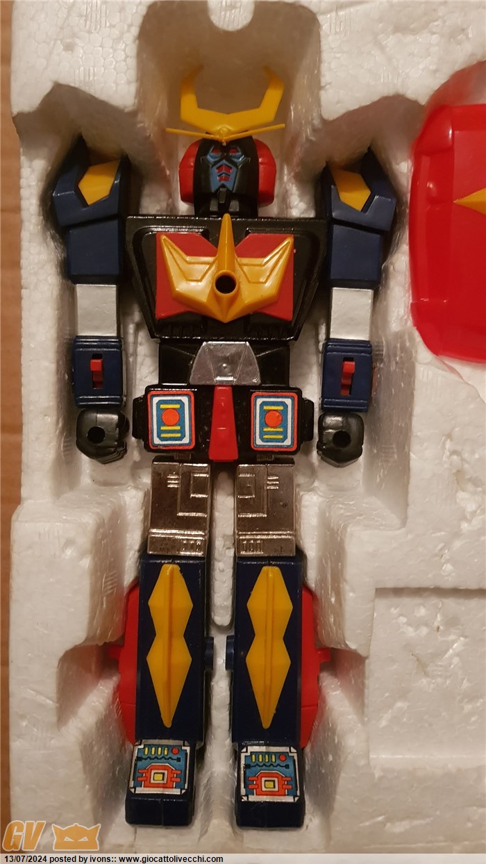 Il robot è in ottimissime condizioni, senza rotture e con vernici ancora belle, piccolo segno sul fregio ma integro, giunture braccia e ginocchia/gambe non allo stato di fabbrica ma buone.