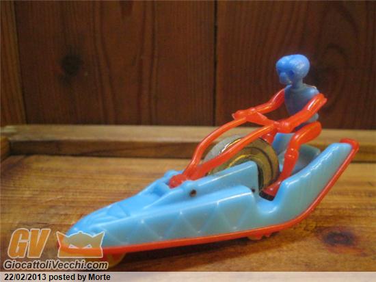 Molto carino, mi ricorda dei giocattoli simili, delle motorette a frizione con il pilota che poteva fare le stesse evoluzioni dell`alieno in foto. A seconda di come lo mettevi la moto impennava: io da piccolo staccavo sempre le mani del personaggio dal manubrio al quale erano fuse. Ricordo che li acquistavo nei tabaccai/edicole più forniti di taroccume.