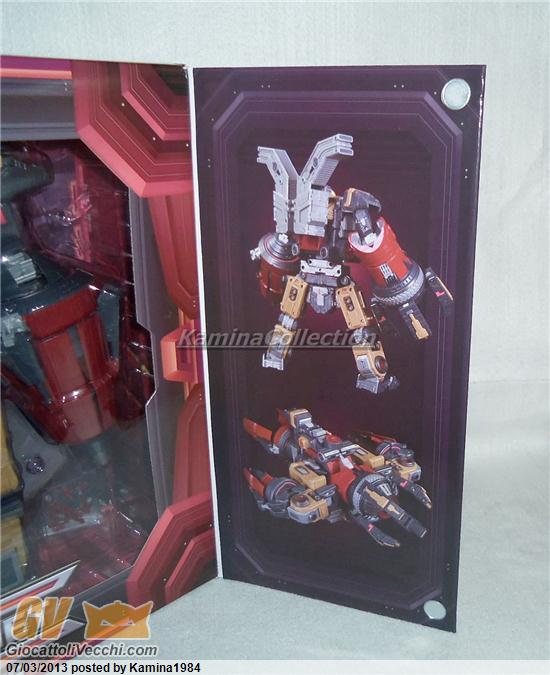 La modalità “Guardian“, in realtà, è la prima che possiamo subito ottenere dato che il transformer è già “presentato” in questo modo dentro la confezione. Basta soltanto aprire i due scompartimenti collocati dietro le spalle e far fuoriuscire le antenne radar (la estremità di ciascun antenna è ruotabile di 360°, a noi la scelta della loro inclinazione). Sul “waist” di Omega Supreme sono collocati due “guns” sferici che vengono ottenuti ruotando la base circolare degli stessi; identica cosa anche sulle antenne dove ne abbiamo due frontali e due posti posteriormente. Passiamo adesso ad analizzare le due braccia di Genesis, il vero fiore all’occhiello di questa configurazione. Sul braccio destro, come arma, troviamo una enorme tenaglia i cui “denti” sono particolarmente snodabili dato che abbiamo ben tre punti di snodo per ciascuno (due sono determinati dall’aggancio in PVC che ancora il “dente” all’arma, l’altro è collocato tra l’estremità del “dente” stesso e il proprio braccio). La “drill” sul braccio sinistro è apribile; anche in questo caso i pannelli rossi godono di molta mobilità che ci permetterà di determinare a nostro piacimento l’apertura più o meno vistosa dell’arma del transformer. Nella modalità “Guardian” Omega Supreme raggiunge le sue massime dimensioni: 43, 5 cm circa di altezza e 35, 5 cm circa di larghezza. Rapportato con altri “bestioni robotici” contemporanei, Genesis è persino più voluminoso e immenso dell’ Hercules prodotto dalla TFC.