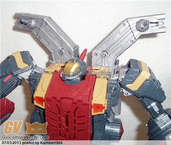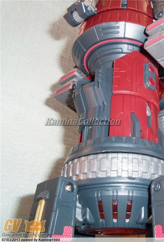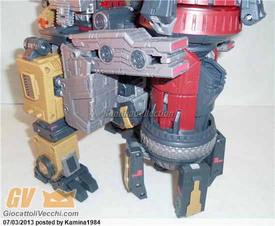 Come già detto, questo transformer è un “triple changer” a tutti gli effetti (anche se sulla configurazione in “Space Station“, come ho già fatto notare, la discrezionalità nella realizzazione del risultato finale è nelle mani di ogni singolo proprietario). Lasciando, quindi, da parte la seconda trasformazione, concentriamoci sulle altre due. La modalità “Guardian” è praticamente quella di partenza: ottenerla, o meglio completarla, è operazione immediata come già anticipato prima. Passare da questa configurazione a quella “Space Cruiser” è tutto sommato semplice (anche se, lo ripeto, le istruzioni non semplificano assolutamente la comprensione dei vari passaggi). Le spalle devono essere sganciate dal corpo del robot, il “waist” deve ruotare di 90° per permettere alle braccia di ancorarsi una sul petto, l’altra sulla schiena di Omega Supreme. Le gambe subiscono una rotazione di circa 180°, terminata la quale si affiancano al corpo dell’Autobot. I piedi ruotano di 90° lungo l’intero asse verticale. Terminate queste fasi, è sufficiente installare i motori principali, rappresentati dalle armi tenute nelle braccia di Genesis (anche in questo caso, vi rimando a quanto già detto sopra).