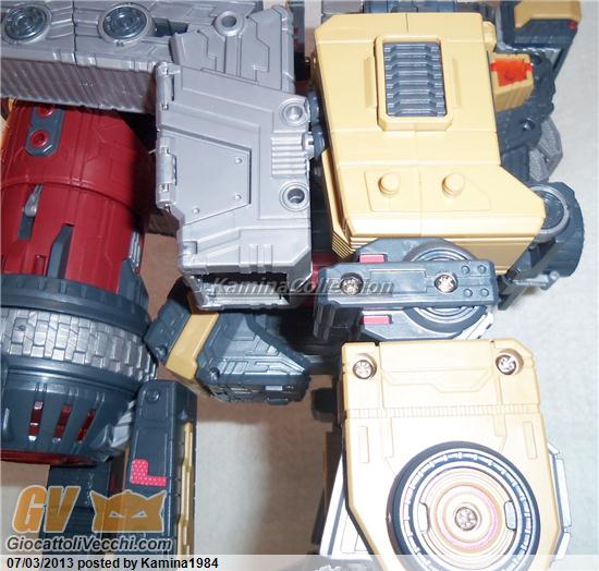 Adesso sarà necessario approfondire uno degli aspetti più incredibili e meglio riusciti dell’intera realizzazione di questo toy. Omega Supreme gode di una snodabilità e posabilità mai viste prima (per un prodotto di tali dimensioni, ovviamente). La progettazione dei sistemi di snodo, i cosiddetti “joints”, è semplicemente perfetta. L’aspetto veramente impressionante è rappresentato dal fatto che nonostante la mole e il peso del transformer, fare assumere particolari pose a Genesis (ovviamente questo richiederà un minimo di pazienza per lavorare proprio sui numerosi snodi messi a nostra disposizione) è non solo possibile ma anche relativamente semplice. Dalla foto, ad esempio, potete notare come in versione “Guardian” abbia optato per una posa con il braccio destro alzato: ebbene il peso del braccio è notevole e con Omega Supreme collocato in una posizione “standard” riuscire a tenere il suddetto braccio in posizione eretta è impossibile (continuerà inevitabilmente a scivolare lungo il corpo). Ma attraverso una combinazione di pieghe e aggiustamenti degli snodi, ecco che il risultato diventa possibile. E la posa è fissa, stabile e duratura. I “joints”, d’altronde, oltre ad essere davvero “duri”, sono numerosi: innanzitutto, il “waist” può ruotare di 360°, le braccia hanno snodi lungo l’avambraccio e le spalle ma sono soprattutto le gambe e la realizzazione delle medesime che rappresentano la svolta tecnica dell’intero progetto. Abbiamo gli snodi classici all’attaccatura alla vita del robot, poi ne abbiamo due (ripeto due) all’altezza delle ginocchia (uno sopra e uno sotto) con quest’ultime che possono ruotare di 360°, fino ad arrivare ai piedi, i quali, oltre a ruotare su ambo gli assi (la rotazione su quello verticale è di circa 90°), presentano snodi persino nelle dita. Una cura davvero straordinaria in fase di progettazione. Per quanto concerne la resa della colorazione o la cura del dettaglio, non ho nient`altro da aggiungere a quanto già sottolineato in precedenza (ripeto, peccato per quei punti, non molti per la verità, in cui si notano gli agganci ai precedenti "sprues"). Di questo Genesis può spaventare il prezzo, particolarmente alto (senza contare che tutti coloro che non hanno fatto il preorder durante le prime fasi di release non potranno disporre dei led che la casa produttrice dava in omaggio, i quali possono essere installati in numerosi punti del corpo di Genesis).