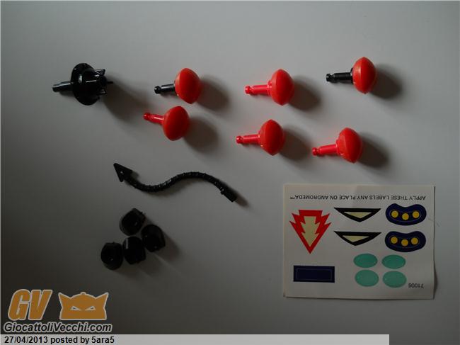 si coda e zoccoli sono anche di pegasus. ( valore sui 10 euro secondo me ) i due neri potrebbero essere i missili seconda versione di Green baron , che infatti in foto è senza missili. ( valore 3-4 euro ) gli altri missili rossi potrebbero essere di pegasus ( seconda versione pure loro , quando per legge la GIG fece ogni missile tondo nelle nuove edizioni ) il pezzo nero è un cingolo di pegasus ( come quello che hai in andromeda ) valore , forse sui 2 euro