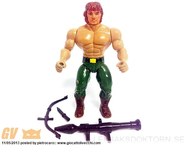 Il militare coi calzoni verdi è più interessante, in quanto una copia della più famosa SARGE TEAM & THE BAD GUYS della REMCO, nati in seguito al filone dei film Rambo di Stallone Anche se quest`ultima non so quanto successo abbia avuto.... interesserebbe solo ai customizzatori credo.... vado al dunque Attack Fighter (detto anche Rambo knock off) della linea Global Assault Force 1. Azienda: Madison Linea composta di soli 4 personaggi nata e morta nello stesso anno 1980. Curiosità ci sono 2 linee che portano lo stesso nome e logo simile ma personaggi differenti. Valore del personaggio completo loose 12 euro circa.