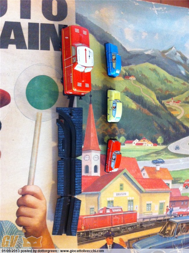 Oltre al Tabellone come avrete intuito ci sono il treno composto da tre vagoni e un Loco diesel, tre macchinine di colori diversi naturalmente in metallo/latta aratteristiche dell`epoca.