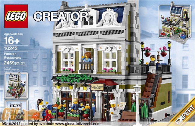 Eeeh questa l`avevo vista in scatola e stamattina ho visto un servizio fotografico da paura. Devo dire che merita veramente un 11! E` il 1° CE che ritengo spettacolare! Il ristorante è un gioiello con tanto di cassonetto nel retro...il cameriere che sciabola la magnum è impagabile. Lo scannatoio al 1° piano e lo studio nella mansarda sono bellissimi e dettagliati da paura. E che dire dei nuovi pezzi inseriti, fighissimi...la vespetta è ultra! Brava LEGO.