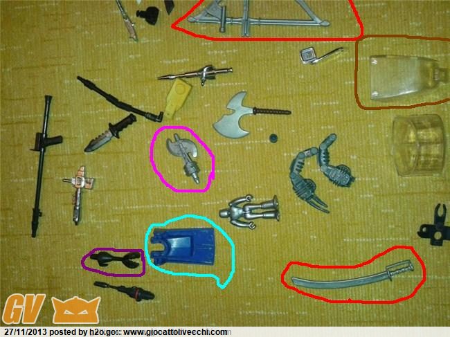 le armi grigie in seconda fotografia sono quelle di Ninjor dei masters quella specie di tenaglie nere sempre in seconda foto sono di Trap Jaw, sempre dei masters l`ascia completamente grigia al centro della seconda foto è di Roboto, masters pure lui