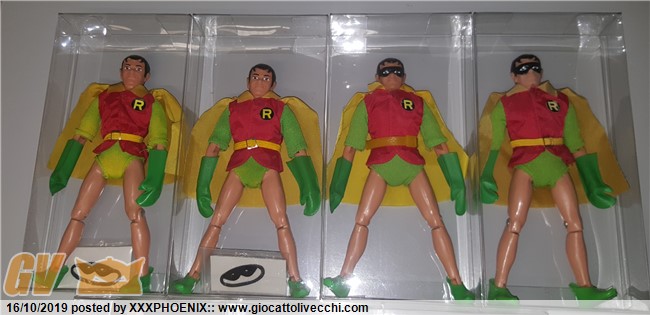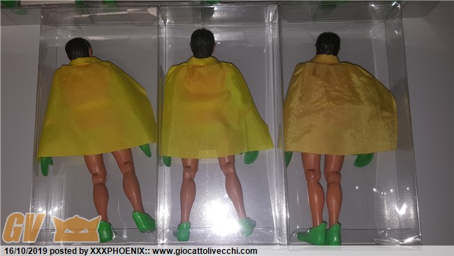 ed ecco ROBIN... Quando ancora avevano prezzi umani riuscii a prendere ben due Robin con Removable Mask ... le maschere sono originali e quello con i pantaloncini verdi ha anche la particolarità di avere un body T0 (corpo T1 ma rivetti in plastica)...probabilmente questo Robin è uno dei primissimi messi sul mercato! L`altro invece è nella variante gialla ( a lungo si è discusso nel Mego Museum se questa variante fosse un particolare scolorimento accaduto a pochi figures)