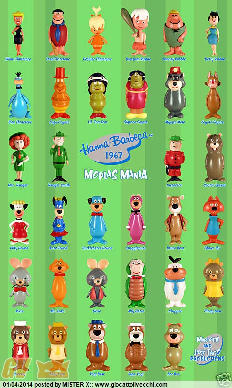 Ciao, I Superbambolotti Locatelli Hanna Barbera della Moplas sono totale 28 Gli Antenati della Neocera Florale sono totale 7 I Topo Gigio della Pavesi sono totale 20 + 8 calciatori Le Scimmiette e Paperino "fumatori" della Oskar sono rispettivamente 12 pezzi cadauna Esistono tanti altri pupazzetti anni 60 pubblicitari o del Carosello in plastica soffiata tipo "Moplas" di cui vi allego alcune foto.