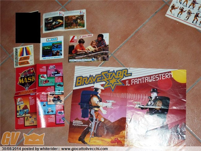 richiedo cortesemente valutazione per successiva vendita del materiale in foto: poster Marshal Bravestarr, poster-cataloghino MASK, adesivi MASK, cataloghino treni Lima, cataloghino Atari, cataloghino Masters MOTU + Big Jim (di questo manca la copertina)