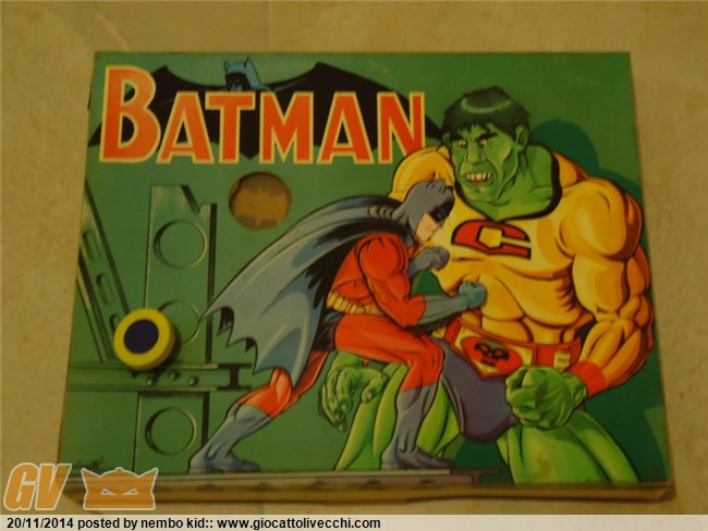 Ho recentemente trovato un gioco di Batman del quale non riesco a trovare nulla in rete. Premendo il pulsante giallo/blu in basso a sinistra si solleva il braccio di Batman, la testa del mostro viene proiettata via (rivelando le facce dell`Enigmista del Pinguino e del Joker) si accende il Bat-segnale e una sirena si mette a ronzare (sempre che abbia riposizionato esattamente i componenti elettrici...). Vi è un`unica scritta in un angolo che recita 6 copyraight by National Periodics, ove purtroppo la parte precedente della data è stata eliminata e la firma dell`autore del disegno Minuti. Dal colore del costume e dal logo direi che si tratta di un gioco del 1966, anche se la colorazione del disegnomi sembra abbastanza ricca di sfumature. Qualcuno sa dirmi qualcosa in merito?