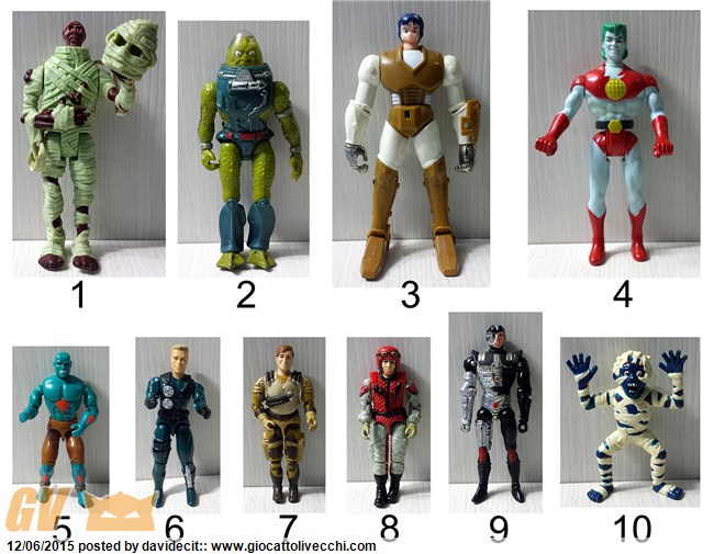 Ciao, Il numero 2 è Kalamarr (Slushhead), della serie He Man new adventures 3- Shido dei 5 Samurai 4- Captain Planet dall`omonima serie 5- Blanka di street fighter II, credo sia quello della serie g.i. joe 6-7-8- sono tutti g.i. joe, non conosco i nomi 9- Lord Dread della serie Captain Power