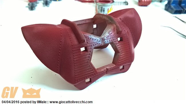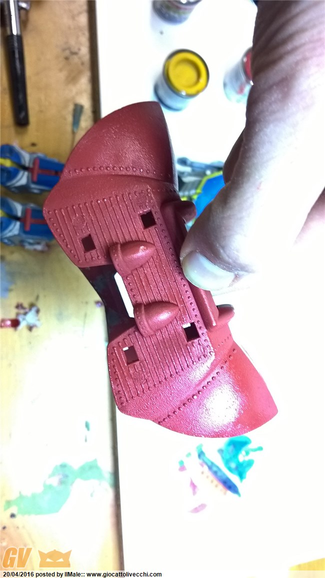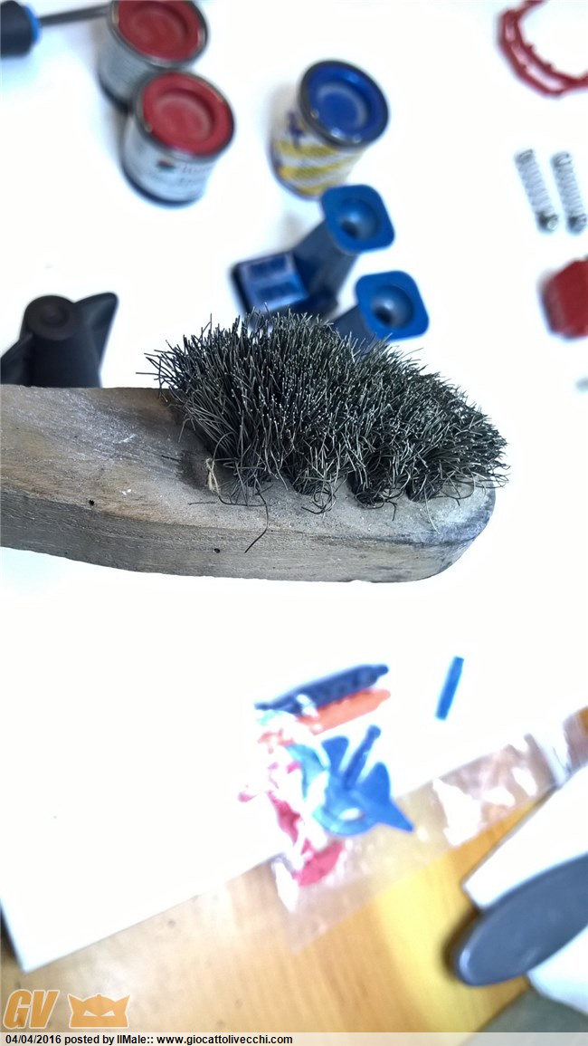 Ciao ragazzi...e ragazze!! Uso l`areografo, ma solo perché e più facile reperire il colore giusto, per una più fedele colazione industriale, la bomboletta sarebbe più appropriata. Si le corna basta passare un po` di pasta abrasiva con la rispettiva spugna e il gioco e` fatto!! Domani do la seconda mano di rosso e poi probabilmente un fissativo lucido... Dopo ovviamente aver colorato anche la parte argento...... Ovvio!!