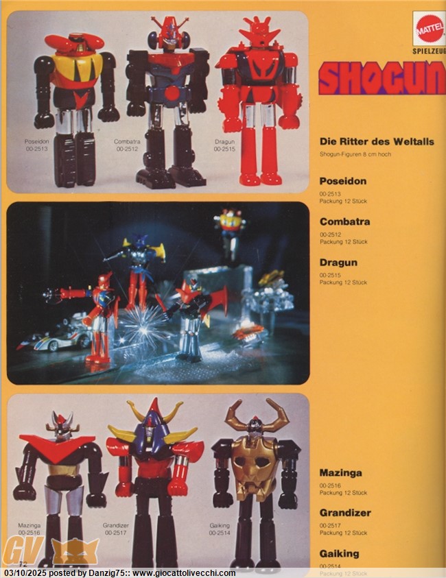 E però la linea Shogun Warriors Mattel è precedente perché i primi giocattoli, figli della collaborazione tra la Popy e la Mattel, sono prodotti prima del 1977 se è vero che già in quest’anno, negli Stati Uniti, erano disponibili gli Shogun da 60 cm. Mentre è già a partire dall’anno successivo il 1978 che gli Shogun Warriors collector, nella prima mandata di 6 (i nagaiani più Combattler), sono disponibili nei cataloghi e nei negozi americani.