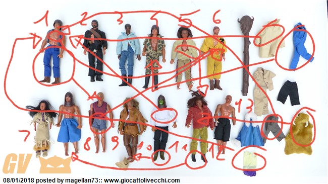 Salve a tutti Potete aiutarmi con questi Big Jim Non li conosco e non sono in grado di abbinare i vesitini, ne capire se quelli indossati sono inerenti ai personaggi stessi