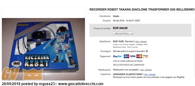 Compralo subito del 26 settembre 2018. Sito : ebay.it Toy : https://www.ebay.it/itm/RECORDER-ROBOT-TAKARA-DIACLONE-TRASFORMER-GIG-BELLISSIMO/323461329098?hash=item4b4fcc30ca:g:~MUAAOSwd0ha6DPA Prezzo 540, 00 euro. Scatola più che buona, robot e polistirolo pari a nuovo, adesivi attaccati, istruzioni presenti.