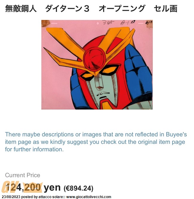 Buongiorno....allora si , la contrattazione e`stat un po` punga in base al prezzo che chiedeva ma poi alla fine gli ho fatto piu`di un acquisto quindi sono riuscito ad abbassare un po` il prezzo ! si vero lui affermava che facesse parte del primo episodio , e come ha detto Elmo c`era il problema del mento (mi sono dimenticato di controllare se e`stato ritoccato come spesso capita di trovare dei ritocchi sopra l`acetato)- giovedi quando rientro in Italia guardo subito comunque quella del mento e`una cosa strana .... molti dei cel di daitarn di sigle o prime puntate che trovo hanno quello giallo , poi quando cerci nell`episodio sono grigi (a parte da meta` serie) e come detto da voi non vorrei che le ritoccassero per utlizzarli in altri episodi PS : mi e`arrivata anche una Mach Patrol (non il top) ma difficile da trovare