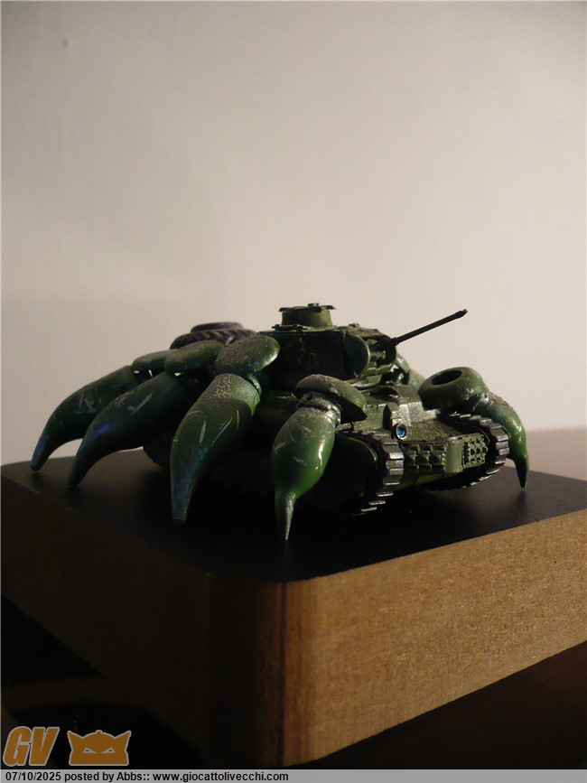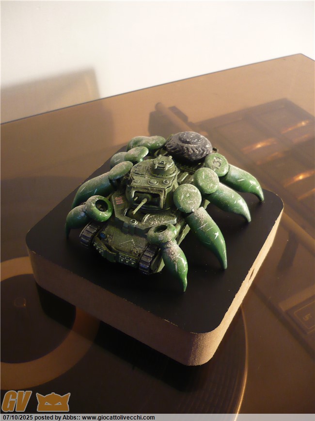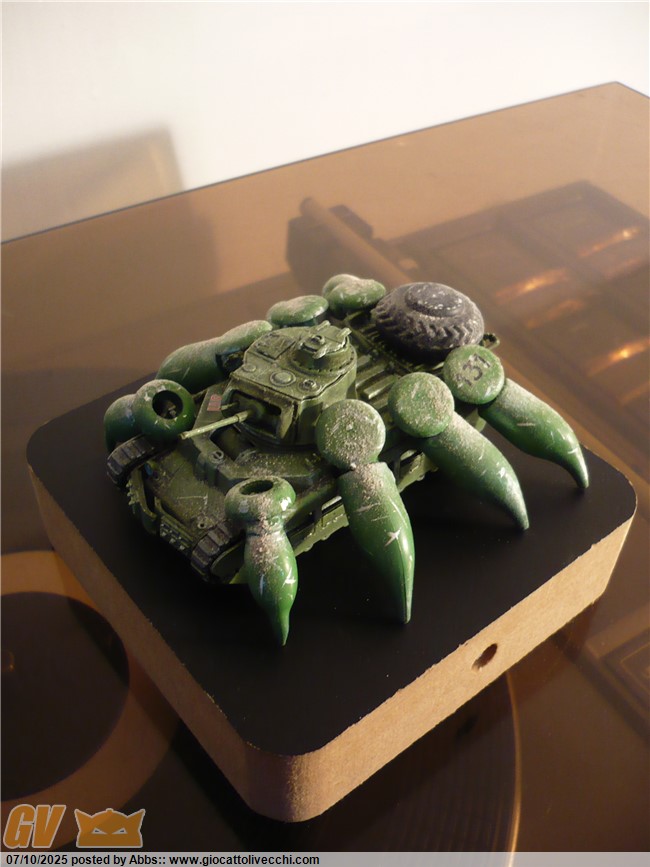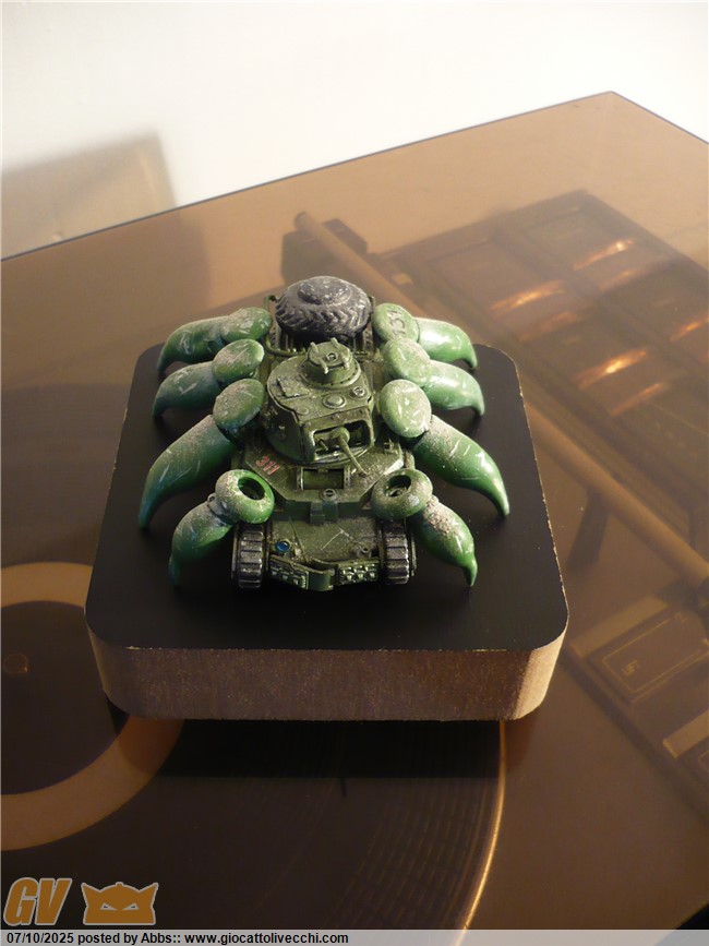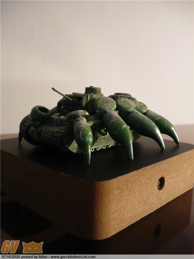 ma perchè Tarantula 2 e non Tarantula 1? semplicemente perchè prima di questo ne avevo fatto un altro di simile ma in scala più grande e sulla base di un altro tank. più avanti magari lo posto. questo comunque, come si avvince dalle immagini, sembra proprio una tarantola, con quelle zampe tozze e il corpo massiccio dove la ruota di scorta, al servizio di altri veicoli, ne simula l`addome. se lo si guarda da lontano sembra proprio un ragno! e invece è un tank; un tank modificato per arrampicarsi dappertutto. visto che in questo post si parla di modellismo classico, anche per questo modello sono partito da un vero e proprio kit in scatola, più precisamente mi sono avvalso di un semplice tank inglese della classe Matilda in scala 1/76 della Airfix; il famoso MKII Matilda, e poi mi sono divertito a customizzarlo. il modellino risulta piccolissimo, come dicevo è in scala 1/76, e dal vero sembra proprio una piccola tarantola. bello secondo me anche in coppia con l`altrettanto possente e tozzo Drednought di inizio post. li potete vedere qui sotto.