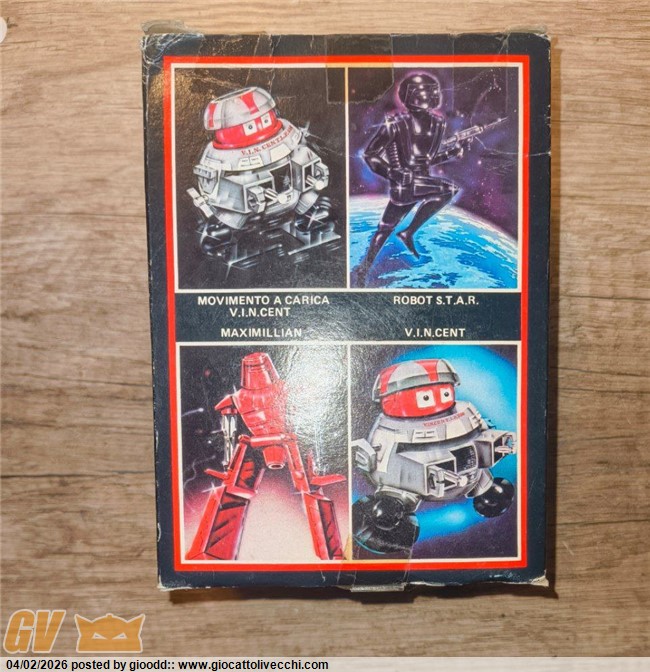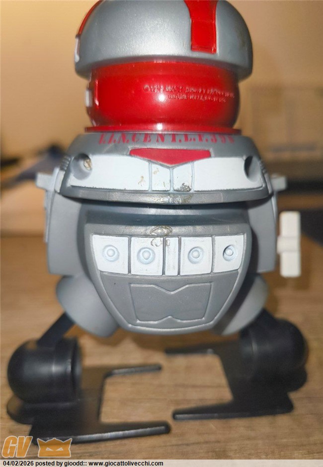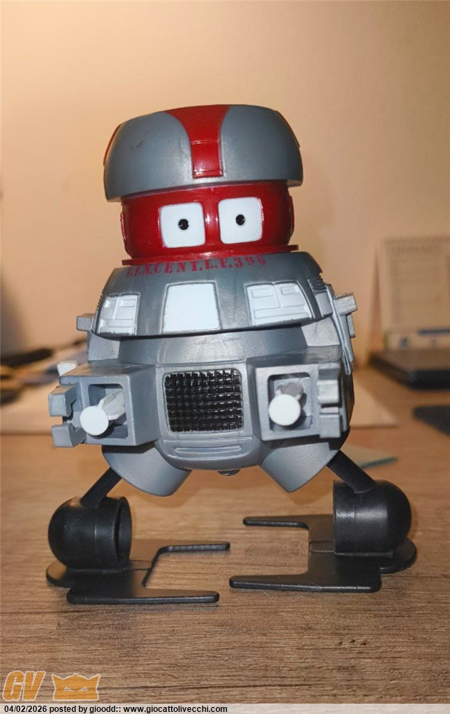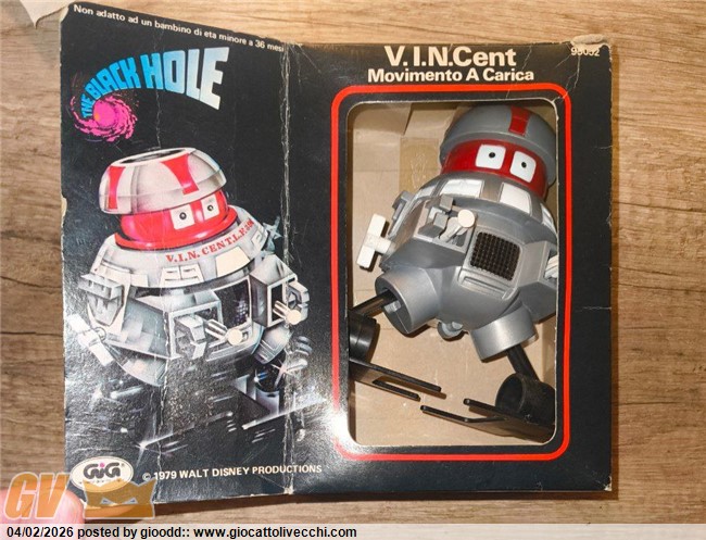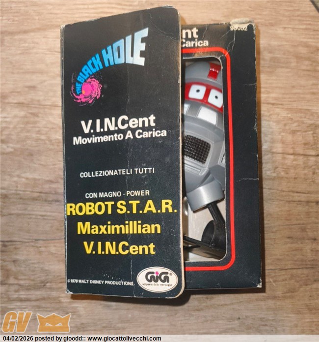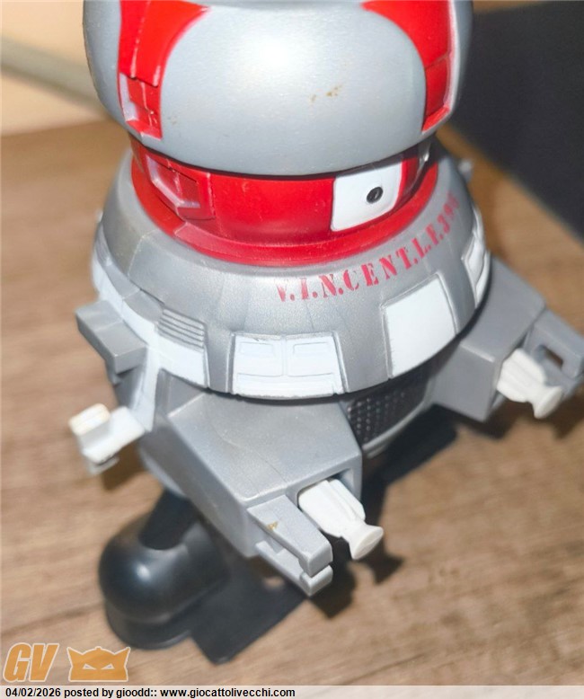Ciao ragazzi ho trovato questo walking vincent movimento a carica del 1979 distribuito da GIG. Il meccanismo funziona, il robot ha alcuni difetti come si può notare in foto e la scatola non è in buone condizioni. Ho cercato informazioni online ma ho trovato pochissimo riguardo a questo pezzo, l`unico venduto che ho trovato è un`asta risalente al 2024.