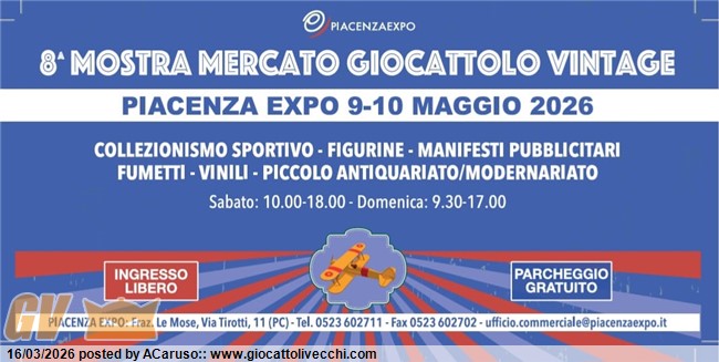 "Mostra Mercato Giocattolo Vintage " 8^ Edizione Quartiere Fieristico "PIACENZA EXPO " Via Tirotti nr. 11 (Accanto casello di PC sud ) Sabato 09 e Domenica 10 Maggio 2026