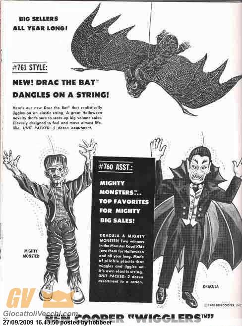 "Ben Cooper Rubber Monster Toys: Rubber toys, or "jigglers," are known for their jiggly movement, oily texture and strong odor. They were sold in dime stores and small retail outlets. Some stores arranged several rubber toy display boxes along an aisle, creating a rubber toy "bazaar." Children followed their nose to the rubber aisle, where they found characters ranging from zoo animals, to super-heroes, to monsters. Ben Cooper built its reputation on manufacturing Halloween costumes and novelties. Its dominance in the rubber toy market began in the late 1960`s, when it released the Flying Fun Things. These crudely sculpted super-heroes were molded in a horizontal flying position and dangled from an elastic band. Ben Cooper built on the success of the Flying Fun Things by releasing a broad range of rubber figures over the next decade. In 1973, Ben Cooper introduced its rubber monsters. It marketed them under different names and styles, the most distinctive being the "House Haunters." Characters included: Witch, Devil, Scarecrow, Black Cat, plus generic versions of Frankenstein, Dracula, Wolfman, and even Aurora`s Forgotten Prisoner skeleton model. In addition to the House Haunters, Ben Cooper produced the "Creature People." These half-human, half-insect creatures captured the essence of 1950`s B-movie mutations. A purple male and yellow female were produced. A Mummy, Hunchback, Caveman, smaller Frankenstein and Lugosi-like Dracula were often sold alongside the Ben Cooper monsters. But these do not possess the Ben Cooper copyright. It is unclear who manufactured them, but they seem to have been distributed by Ben Cooper. One of the last Ben Cooper rubber monsters was Godzilla, released in 1980. Like the Mattel Shogun Godzilla of the late 70`s, this toy did not possess Godzilla`s famous stegosaurus spines. "