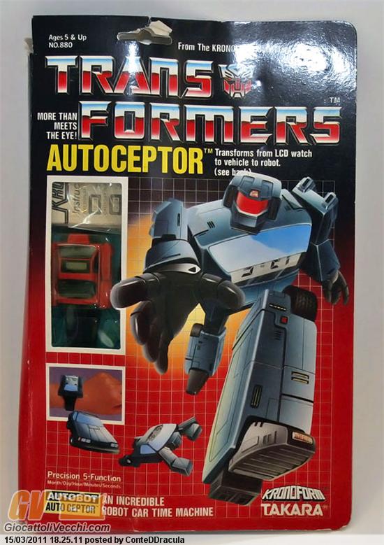 Sempre in tema di G1 ed orologi... questo qui pure ha una sua storia particolare. Difatti e`evidente come la confezione sia diversa dalle solite g1: richiama apertamente il passato (notate il logo Kronoform = diaclone), un po`come avvenne con l`avvicendamento che gig tenne per molti anni di Transformers G1 e Trasformer sui suoi box contemporaneamente, fino alla sparizione di quest`ultimo.