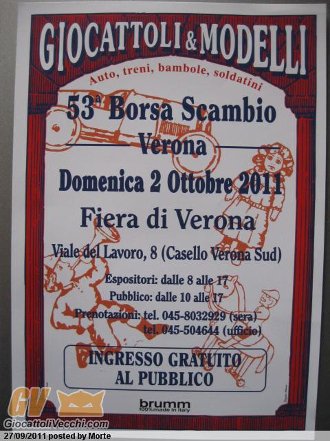 Prosegue in quel di Verona la 53° edizione della borsa scambio del giocattolo da collezione. Consolidata nel tempo, questa borsa scambio e` diventata per volonta` degli organizzatori, un punto di riferimento per il collezionista di automodelli, non a caso proprio agli espositori venivano date in omaggio fino a poco tempo fa delle macchinine confezionate esclusivamente per tale evento.Va detto pero` che a differenza della appena passata mostra di Canneto, trovano spazio anche le altre categorie di giocattoli, ed i nostri cari robot e giocattoli 70` - 80` non sono relegati a "misere" rappresentanze, quindi questa volta, mi sento di suggerire di prenderla in considerazione, tant`e` che l`ingresso rimane gratuito. Come di consueto ci dovrebbero essere circa 200 espositori, tra i quali il sottoscritto in compagnia di Evildead e Ghiako Gatori. Apriamo le danze e vediamo chi ci sara` ad esporre e chi verra` da visitatore..