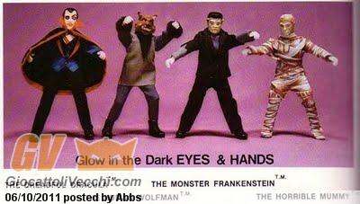 guardanndo nel mio archivio mi sono accorto che nella classifica mi ero anche dimenticato di inserire altri due prodotti degli anni 70. il primi sono i Mad Monster della mego che qui sotto potete vedere in una rara immagine del catalogo del 1974. è una grave mancanza, perchè essendo del 74, sono tra i primi prodotti ad aver utilizzato la fosforescenza a scopo ludico. il loro poere era limitato, ma essendo dei mostri dell`orrore, il fatto che gli si potessero illuminare gli occhi e le mani, li rendeva ancora più terrificanti. per questi due motivi, avrebbero occupato anche loro uno dei piani alti della classifica. il fatto di donare la fosforescenza solo agli occhi ed alle mani, poi, era in fondo giusto, perchè non sarebbe stata, secondo me, un`idea riuscita, quella, per esempio, di fare un uomo lupo tutto fosforescente. stessa cosa per dracula o frankenstein. un alieno sì, lo si può fare tutto fosforescente ma agli altri mostri classici, secondo me, bastavano appunto parti minime come occhi o mani. mi scuso con tutti gli appassionati di mostri classici e di horror in generale ( come del resto lo sono anche io ) per questa mancanza.
