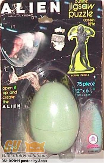l`altro prodotto è del 1979 e si tratta del famigerato uovo di alien!!! !!! il gioco si riduceva a poco, ed il divertimento era quasi effimero! il divertimento costituiva nell`aprire l`uovo fosforescente e costruire un micro puzzle dello xenomorfo! sì! magari in un secondo tempo si poteva tenere l`uovo e riempirlo con uno slime di un`altra serie, ma l`idea ludica di partenza era comunque sterile. di bello cè che l`uovo è completamente fosforescente e se tenuto nel suo blister, fa una bellissima figura per un collezionista della seri alien e non. questo gioco, comunque, avrebbe con tutta probabilità occupato l`ultima posizione della mia personale classifica fosforescente. ma comunque mi piace molto lo stesso e lo trovo orrorifico! in oltre ho una personale spiegazione, vissuta sul campo, riguardo al suo insuccesso commerciale: erano gli anni 80. vicino a casa mia, in un negozio che vendeva un pò di tutto, dalle ferramenta, ai vestiti fino ai giocattoli, erano rimasti invenduti dal 79, due confezioni di uova di alien. io ed un mio amico appena le abbiamo viste ce le siamo comprate subito! per quanto riguarda il mio uovo, niente di strano! ho tirato fuori i pezzi del puzzle, un pò sconsolato, e morta lì, il mio amico invece ci ha trovato dentro un Facehugger vero e vivo! ho visto quella creatura shizzare dall`uovo con la velocità di una serpe, ed apppiccicarsi come una ventosa sulla faacia del mio amico! a differenza del film però il futuro Xenomorfo, si è staccato subito ed è fuggito infilandosi in un tombino delle fogne! ho unaspiegazione tecnica per quella fuga improvvisa: negli anni 80 girava la leggenda che nessuno sarebbe mai riuscito a mangiare un pacchetto intero di Fisherman. beh! pocro prima di acquistare quelle uova, io ed il mio amico avevamo provato a sfatare questa leggenda sfidandoci in duello. a stima ce ne saremo ingollate circa una decina a testa, con la vittoria del mio amico e credo quindi che quell` alieno non abbia sopportato il potere olfattivo di quelle caramelle micidiali, dandosela poi a gambe, beh gambe! diaciamo dandosela ad arti, giù nel tombino. ci pensate? ha preferito le fogne alle fisherman!! da quell`avvenimento ho capito che i Facehugger del film erano veri. infatti non capivo come potessero essere fatti così bene. probabilmente Ridley Scott e quelli dlla sua troupe, li avranno ciulati in qualche silos dell`area 51. dicono che lì ci siano un sacco di cose simili.