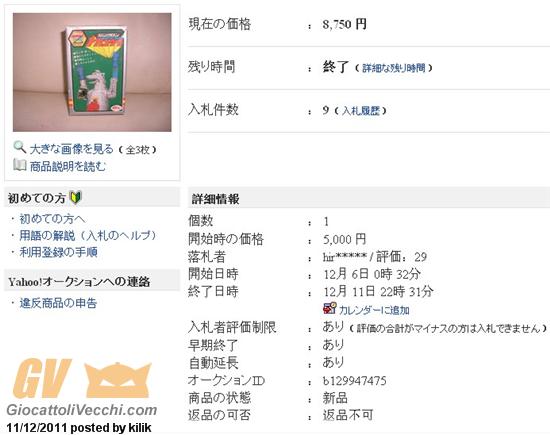 Asta del 11 Dicembre 2011 Sito: Yahoo Japan Link asta: http://page2.auctions.yahoo.co.jp/jp/auction/b129947475 Toy: Bullmark/Zincron - MechaGodzilla Metal [In Box] Prezzo: 8, 750 yen = Euro 84 circa