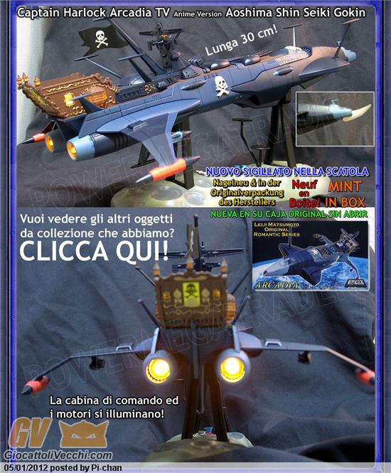 Io una ne ho di Arcadia e posso parlarti solo di quella... Se cerchi la mia collezione, dovrebbe essere la seconda o terza foto se non ricordo male. Comunque, quella che ho io é della Aoshima, versione Limited, in quanto ha una colorazione blu scuro che é preferibile e meno "pastelloso" rispetto al verde della versione base. E` lunga circa 30 CM, é composta da metallo e plastica e pesa un botto. Ci sono delle funzioncine che accendono le luci della sala comandi e dei reattori posteriori. I cannoni sono semoventi e ci sono addirittura le ancore. Insieme all`astronave ci sono due miniature di piombo di Capitan Harlock e del nanetto di cui non ricordo il nome. Non sono colorate, ma credo che un modellista serio e capace possa dargli una "verniciata" e farle carine. L`unica cosa che non mi piace é la base su cui é poggiata. Giallo plastica andato a male, veramente inguardabile. Io ho risolto posizionando delle pietre di sale davanti in modo da coprire quell`obrorio e rendere il tutto più piacevole alla vista.