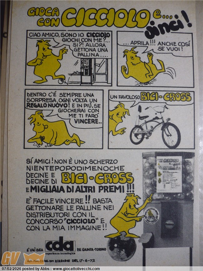 comunque con Cicciolo potevi partecipare ad un concorso della CDA di Torino, un`azienda che probabilmente si occupava di giochi da bar, o sala giochi, come distributori automatici di sorpresine ecc. se infatti in uno di questi distributori automatici di palline con sorpresa trovavi l`adesivo di Cicciolo potevi addirittura vincere una bici cross per spadroneggiare nel quartiere e speronare i tuoi antagonisti con biciclette classiche. Cicciolo quindi era un mostro portafortuna! e chissà che non ci fosse anche lui in una di quelle palline. sarebbe stata bella una riproduzione tridimensionale di Cicciolo. chissà che fine ha fatto Cicciolo, è dal 1972 che non si vede più. chissà dove vanno a finire tutti questi mostri del passato; eppure esistevano! sarebbe bello avere anche il suo adesivo, e ancora di più il suo distributore automatico originale! un bellissimo pezzo da collezione per tutti gli appassionati di mostri e sorpresine in generale: una macchina automatica mostruosa; una sorta di casa meccanica per Cicciolo, direttamente dal 1972.