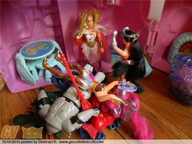 Molto diverso da quello che si vedeva nel cartone animato, che era a forma di logo di She-Ra e conteneva solo una sala vuota, dimora dello spirito guida Light Hope, il castello giocattolo è un vero capolavoro degli anni `80, ricchissimo di dettagli e di oggetti di arredamento e decoro a dir poco splendidi. La giusta via di mezzo fra il Castello di Grayskull e la casa di Barbie, potremmo dire