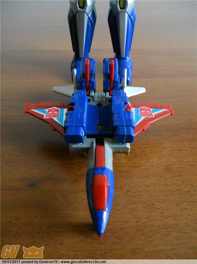 Ed eccolo in tutta la sua imponenza! Il massiccissimo leader degli Autorobot e della divisione Powered Master. Un vero spettacolo! Se pensiamo che è uscito in Giappone nel 1990, e da noi in quell`anno la grande novità erano gli Action Master (scusate, vado un momento a vomitare ). Questo sì che è un gran giocattolo: quattro trasformazioni, motorizzato, cingoli in gomma! Ha un aspetto ormai molto lontano dai primi Transformers di derivazione Diaclone, è in tutto e per tutto un robottone giappo, con tanto di ali, corna, colori classicamente anime, etc., ma quando l`ho avuto in mano mi ha davvero sorpreso per la bellezza dei dettagli, la stazza e la ricchezza degli accessori. Ben fatto, Takara!