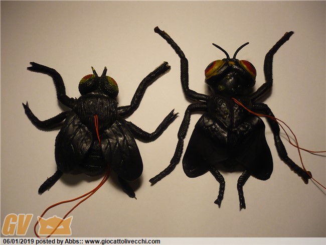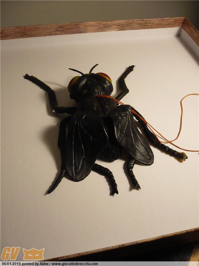 l`altra mosca che vedete qui sotto, invece, non appartiene ad una serie specifica, è uno dei tanti mosconi anni 70-80 made in hong kong, ma è inquietante come le facevano solo una volta e ha delle bellissime ali trasparenti che sembrano vere. come la maggior parte delle mosche depone la sua covata nelle cose marce e in putrefazione, anch`essa è nera come il petrolio ed è un vero jiggler del passato!