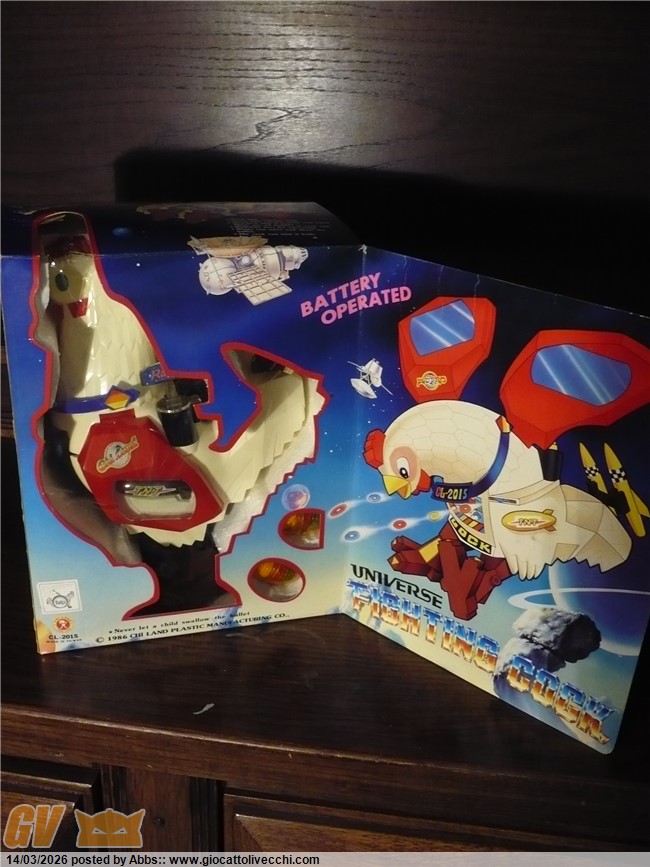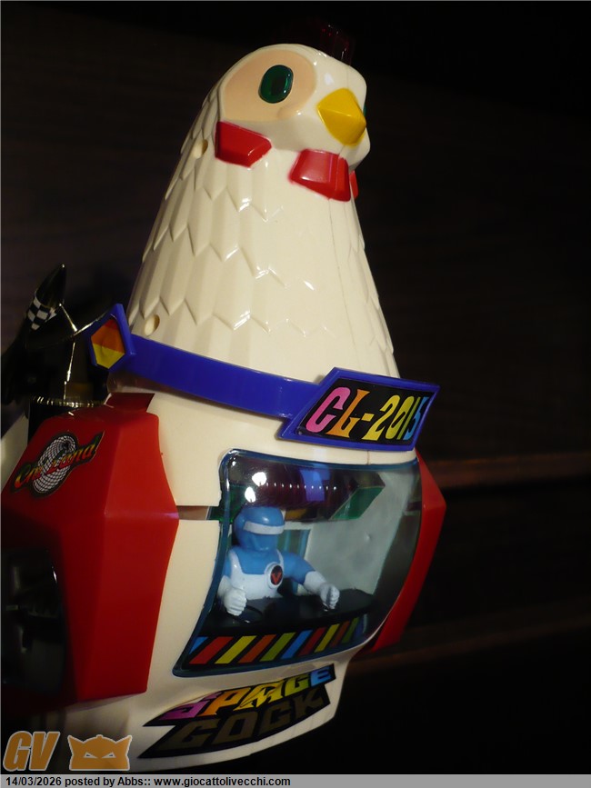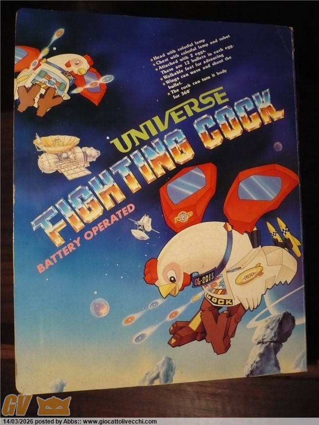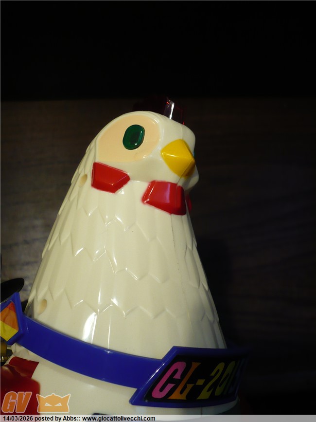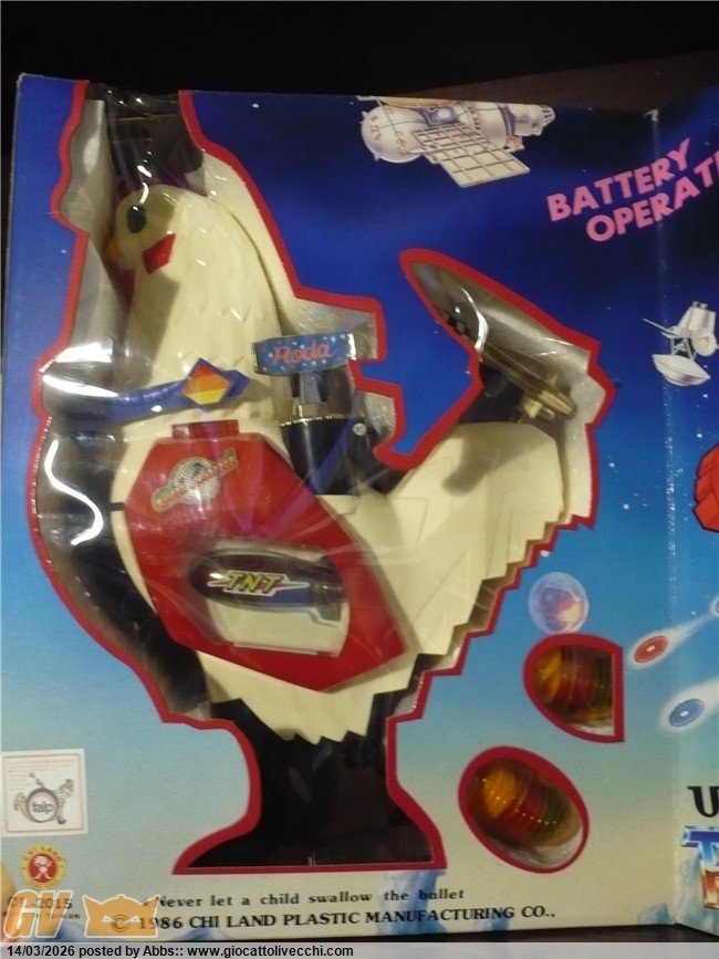una gallina atomica pilotata da un coglione tra adesivi pacchiani e improbabili radar. CON DUE UOVA LANCIA MISSILI!!! con una cover sulla scatola che scoraggerebbe all`acquisto anche il più smaliziato degli acquirenti! un robot che non vuole esprimere potenza e carattere ma solo tristezza. un robot che sembra fatto apposta per risultare brutto: come a dire " realizziamo quello che ci pare, divertiamoci, tanto i bambini giocano con qualsiasi cosa, basta che sia simpatica e fantasiosa; piazziamogli qualche missile, due radar, un pilota, un pò di lucine, e il gioco è fatto ". e invece no! infatti questo l`ho trovato nel 2023 circa in un negozietto di campagna, ancora invenduto ed immacolato dal 1986. nessun bambino aveva osato comprarlo; sarebbe risultato troppo ridicolo in qualsiasi contesto ludico. un nemico improbabile, un eroe poco accattivante! ma quando l`ho visto in quel negozietto disperso in campagna, da collezionista maturo mi son detto: no! dev`essere mio! il robot più brutto della storia! un primato che devi avere in collezione! ora, può far sorridere questo robot, ma sono stra sicuro che se fosse esposto in un museo del giocattolo sarebbe senza ombra di dubbio il robot che creerebbe più curiosità e che avrebbe più successo scaturendo dai visitatori frasi come: " aha aha aha! guarda, un robot gallina!! " oppure: " papà me lo compri? " " eh, ma è vecchio, chissà quanto costa" o ancora: " no! questo non l`avevo mai visto! troppo bello! ". insomma, questi secondo me dovrebbero essere i pezzi che interessano di più al collezionista maturo. i vari Mazinga ecc ovviamente si sa che sono stupendi ma riguardano più un concetto legato al ricordo dei cartoni animati, e sono nati per essere belli, pezzi osceni come questo invece sono pura storia del design ludico! puro cubismo del giocattolo, e state certi che in un eventuale museo del giocattolo, potete anche presentare tutti i jumbo più rari e costosi che volete, tutti i robot DX del mondo, ma alla fine questo robot a forma di gallina o di gallo sarà sempre quello che creerà più ilarità e commenti, questa è una certezza! e dici poco! surclassare milioni di euro grazie ad un design che più brutto non si può! perchè è impossibile creare qualcosa di più brutto ed ingenuo. è un onore averlo in collezione. il robot più brutto di sempre. e comunque è ricercato dai collezionisti di robot battery operated ed automi. caratterista molto interessante può poi ricordare proprio i primi automi vittoriani a movimento meccanico dove sovente figuravano automi a forma di gallina che facevano l`uovo mentre pigolavano, esattamente come questo! analogia veramente interessante questa perchè dopo l`ottocento non ne hanno più realizzati di simili, mentre questo riprende proprio quel vecchio concetto. in questo contesto è un pezzo veramente interessantissimo: un vero e proprio automa dell`ottocento in chiave moderna. questo robot gallina made in taiwan si poteva trovare in due versioni: bianco, oppure rosa con pilota donna. incredibile come robot!