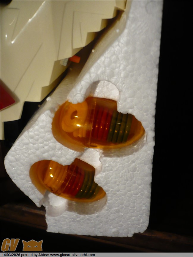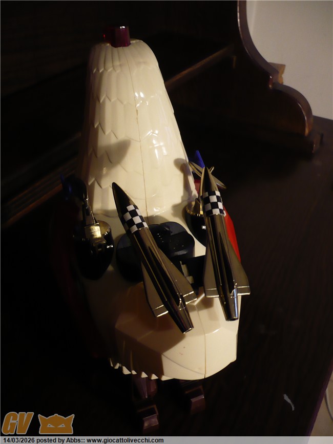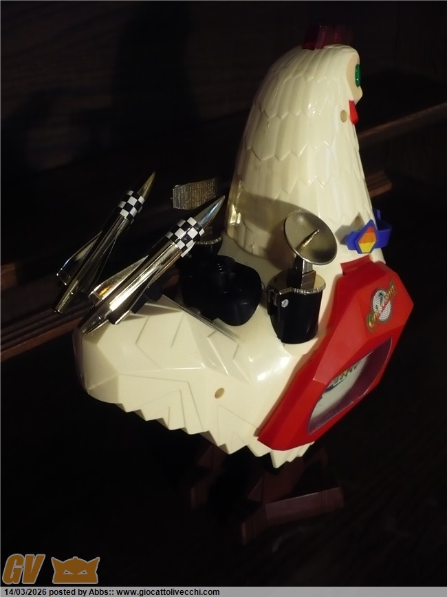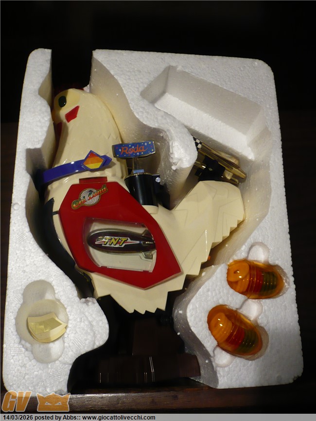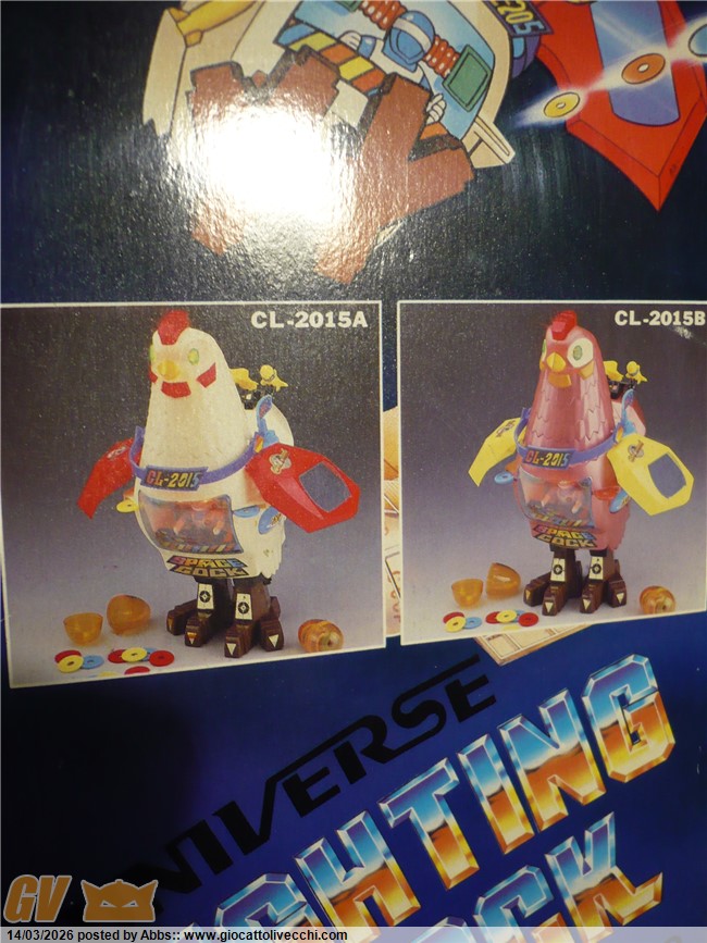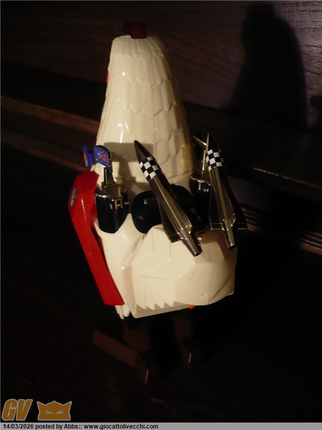 una gallina atomica pilotata da un coglione tra adesivi pacchiani e improbabili radar. CON DUE UOVA LANCIA MISSILI!!! con una cover sulla scatola che scoraggerebbe all`acquisto anche il più smaliziato degli acquirenti! un robot che non vuole esprimere potenza e carattere ma solo tristezza. un robot che sembra fatto apposta per risultare brutto: come a dire " realizziamo quello che ci pare, divertiamoci, tanto i bambini giocano con qualsiasi cosa, basta che sia simpatica e fantasiosa; piazziamogli qualche missile, due radar, un pilota, un pò di lucine, e il gioco è fatto ". e invece no! infatti questo l`ho trovato nel 2023 circa in un negozietto di campagna, ancora invenduto ed immacolato dal 1986. nessun bambino aveva osato comprarlo; sarebbe risultato troppo ridicolo in qualsiasi contesto ludico. un nemico improbabile, un eroe poco accattivante! ma quando l`ho visto in quel negozietto disperso in campagna, da collezionista maturo mi son detto: no! dev`essere mio! il robot più brutto della storia! un primato che devi avere in collezione! ora, può far sorridere questo robot, ma sono stra sicuro che se fosse esposto in un museo del giocattolo sarebbe senza ombra di dubbio il robot che creerebbe più curiosità e che avrebbe più successo scaturendo dai visitatori frasi come: " aha aha aha! guarda, un robot gallina!! " oppure: " papà me lo compri? " " eh, ma è vecchio, chissà quanto costa" o ancora: " no! questo non l`avevo mai visto! troppo bello! ". insomma, questi secondo me dovrebbero essere i pezzi che interessano di più al collezionista maturo. i vari Mazinga ecc ovviamente si sa che sono stupendi ma riguardano più un concetto legato al ricordo dei cartoni animati, e sono nati per essere belli, pezzi osceni come questo invece sono pura storia del design ludico! puro cubismo del giocattolo, e state certi che in un eventuale museo del giocattolo, potete anche presentare tutti i jumbo più rari e costosi che volete, tutti i robot DX del mondo, ma alla fine questo robot a forma di gallina o di gallo sarà sempre quello che creerà più ilarità e commenti, questa è una certezza! e dici poco! surclassare milioni di euro grazie ad un design che più brutto non si può! perchè è impossibile creare qualcosa di più brutto ed ingenuo. è un onore averlo in collezione. il robot più brutto di sempre. e comunque è ricercato dai collezionisti di robot battery operated ed automi. caratterista molto interessante può poi ricordare proprio i primi automi vittoriani a movimento meccanico dove sovente figuravano automi a forma di gallina che facevano l`uovo mentre pigolavano, esattamente come questo! analogia veramente interessante questa perchè dopo l`ottocento non ne hanno più realizzati di simili, mentre questo riprende proprio quel vecchio concetto. in questo contesto è un pezzo veramente interessantissimo: un vero e proprio automa dell`ottocento in chiave moderna. questo robot gallina made in taiwan si poteva trovare in due versioni: bianco, oppure rosa con pilota donna. incredibile come robot!