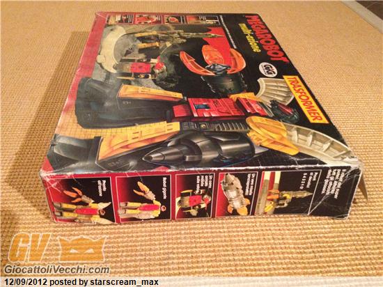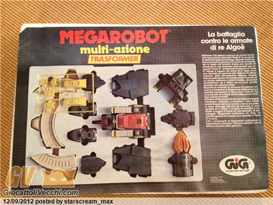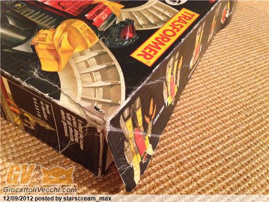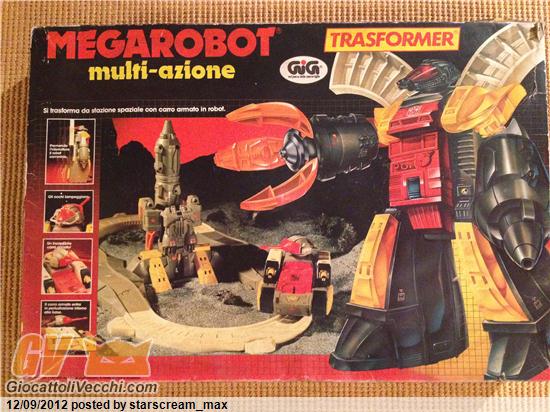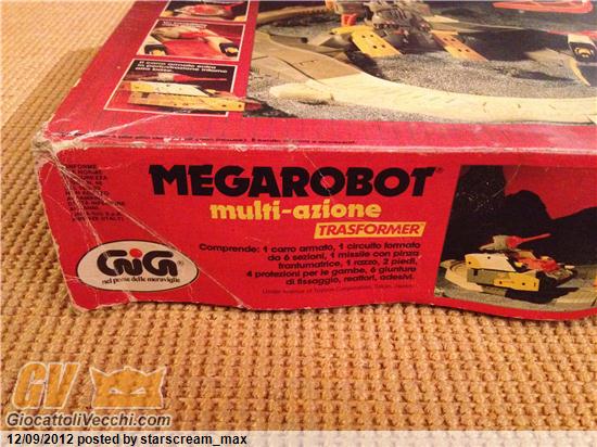 Qualcuno di voi puo` aiutarmi a capire la valutazione per una eventuale vendita di questo robot in mio possesso da una vita? Si tratta di un Megarobot della serie Trasformer della GIG. Non ricordo a quale anno risalga, sulla scatola c`e` solo un riferimento ad una legge di sicurezza sui giocattoli del 1983. Come si vede (spero!) dalle foto, la confezione e` invecchiata, presenta gli angoli consumati ed un lembo di un bordo scollato. Pero` non ha parti mancanti, penso che con un po` di Pritt si possa sistemare!