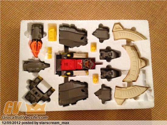 I pezzi del robot sono direi molto ben conservati, ricordo di averci giocato da bambino ma non tantissimo, poi il gioco e` rimasto in un baule nel solaio per una vita. Non mi sembra ci siano segni particolari, sicuramente e` tutto integro e non manca nulla. O meglio, quello che manca e` il foglio degli adesivi (lo so perche` sulla scatola c`e` l`elenco di quello che dovrebbe esserci!). Poi non so se c`era anche un libretto di istruzioni per la trasformazione, che comunque non ho. Pero` le principali fasi per trasformare il robot in base spaziale sono ben fotografate sulla scatola.