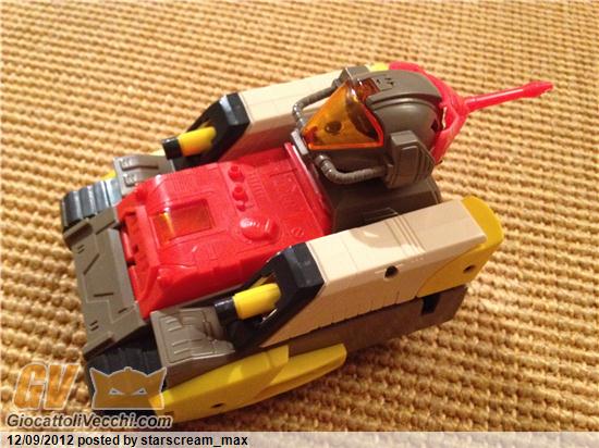 Ah, con 2 pile il carro armato si muove lungo il binario, la torretta gira e si illumina e finge un movimento di rinculo dello sparo. In modalita` robot, questo cammina (o almeno ci prova!). Entrambi i movimenti sono testati e perfettamente funzionanti. Botta di....fortuna pazzesca, c`erano ancora le due pile all`interno (Superpila!) e non si sono minimamente ossidate. Non so dare una spiegazione scientifica a cio`! Grazie a chi vorra` aiutarmi! Max
