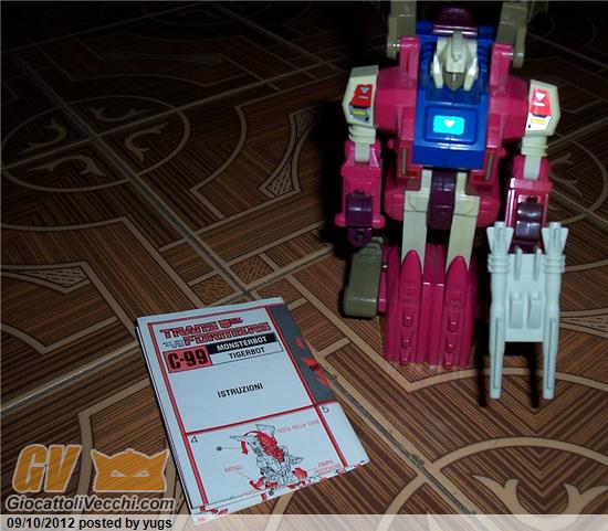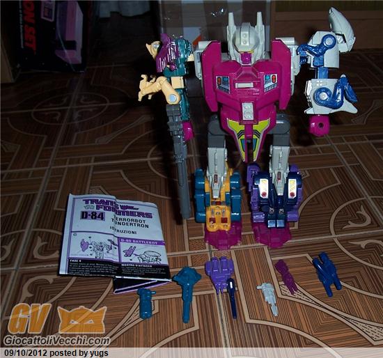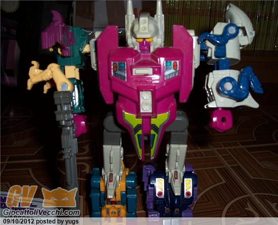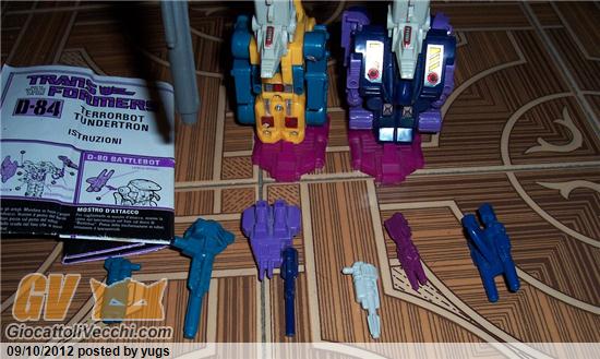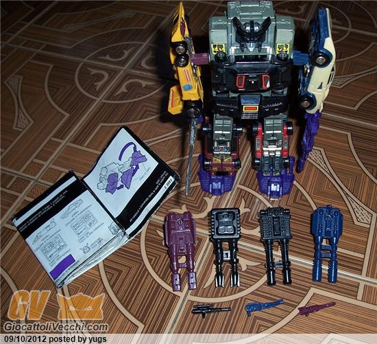 Ciao, ecco altri modelli che ho riassemblato e fotografato, ma di cui non so la valutazione media. Si trattano di: - Abominus/Tundertron: con istruzioni, accessori e armi, niente difetti, manca solo la scatola; - Pentacar/Menasor: manca solo un fucile di uno dei robot singoli, ha istruzioni, niente scatola; - Tigerbot: con istruzioni armi e accessori, senza scatola, perfetto.