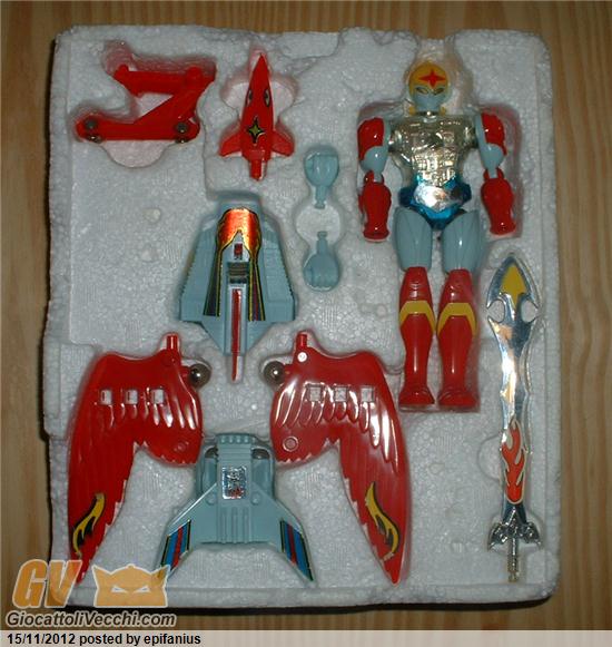 E poi le ali sono dello stesso colore, cosa che spessissimo non accade su questo modello... I due pugni ci sono... La spada è ben cromata... Nessun graffio e/o rottura... Bello lucido... Polistirolo candido... Il box, in foto sembra sbranato, ma dal vivo fa un altro effetto...
