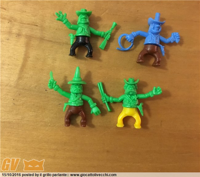 Serie 4 personaggi componibili - Busto: 4 varianti (colori: verde, blu, rosso e marrone) - Pantaloni: pezzo unico (colori: giallo, nero e marrone)