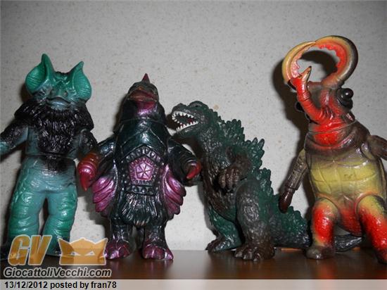 sono tutti della serie godzilla`s gang, il primo si chiama ICARUSU (anche se in alcuni siti si legge PLANETER), così loose vale sui 20\25 come il pollo (BEMUSTAR) e il cervo volante (NKO-GIRIN) mentre il GODZILLA al centro vale oltre 100. sono stati commercializzati come facenti parte della serie di Godzilla, mentre in realtà erano i cattivi della serie ULATRAMAN... spero di esserti stato utile.