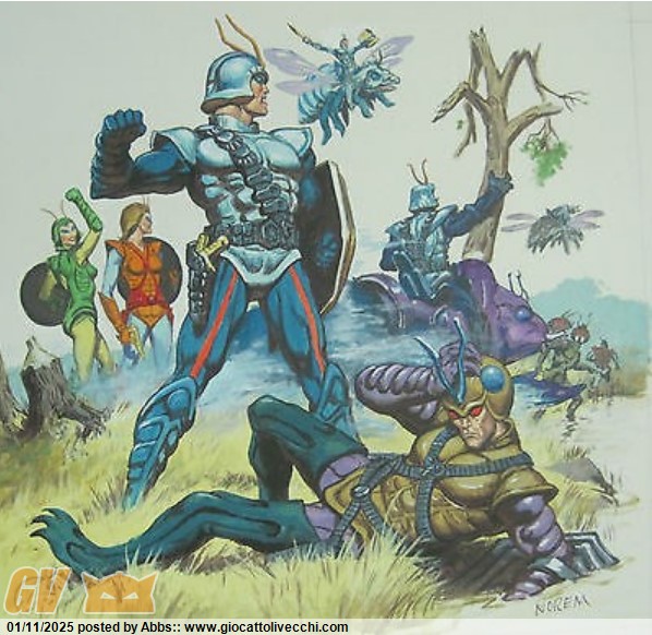 questo meraviglioso disegno realizzato intorno al 1975, è opera dei " fratelli Hildebrandt " Greg e Tim, i grandissimi disegnatori fantasy, non solo fratelli ma pure gemelli, famosi anche per aver realizzato uno dei primi poster per il primo Guerre Stellari del 1977; oltre ad un`infinita produzione di dipinti fantasy di straordinaria bellezza proprio come quello postato qui sopra. dei veri e propri geni del pennello. come si può avvincere dall`immagine poc`anzi postata, l`umanoide sembra proprio un Sectaurs, ha proprio gli stessi occhi e lo stesso sguardo vagamente demoniaco, oltre alle antenne ovviamente.